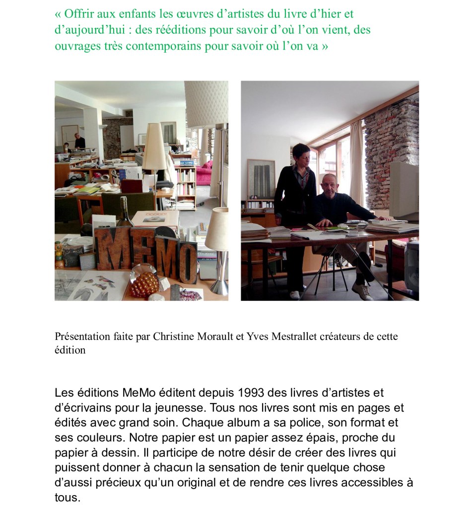 « Les éditions MeMo éditent depuis 1993 des livres d’artistes et d’écrivains pour la jeunesse.